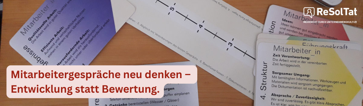 Matthias, Teamleiter in einem mittelständischen Unternehmen, steht vor den jährlichen Mitarbeitergesprächen. Bisher liefen sie nach dem klassischen Schema: Zielerreichung, Bewertung, Bonus. Dieses Jahr probiert er etwas Neues aus – das ReSolTat-Kartenset.